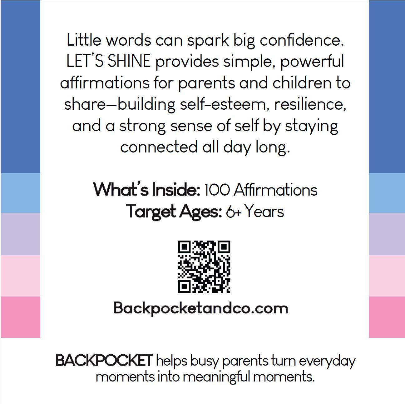 For when you want to nurture your child’s inner glow | Little words can make a big difference. LET’S SHINE offers simple, empowering affirmations designed for parents and children to share together—building self-esteem, resilience, and a strong sense of self through everyday moments of encouragement.